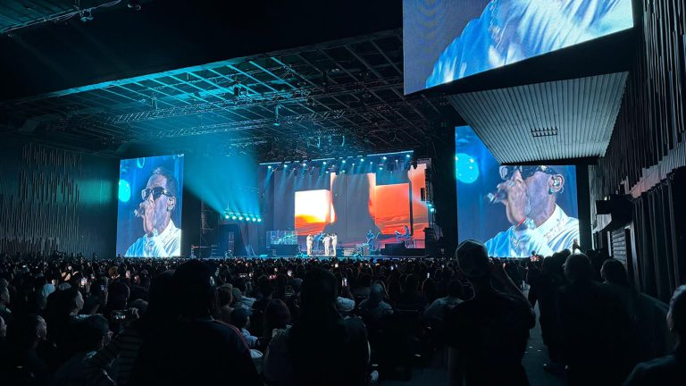 Wide shots of the stage, close-ups of performers, and audience reactions.